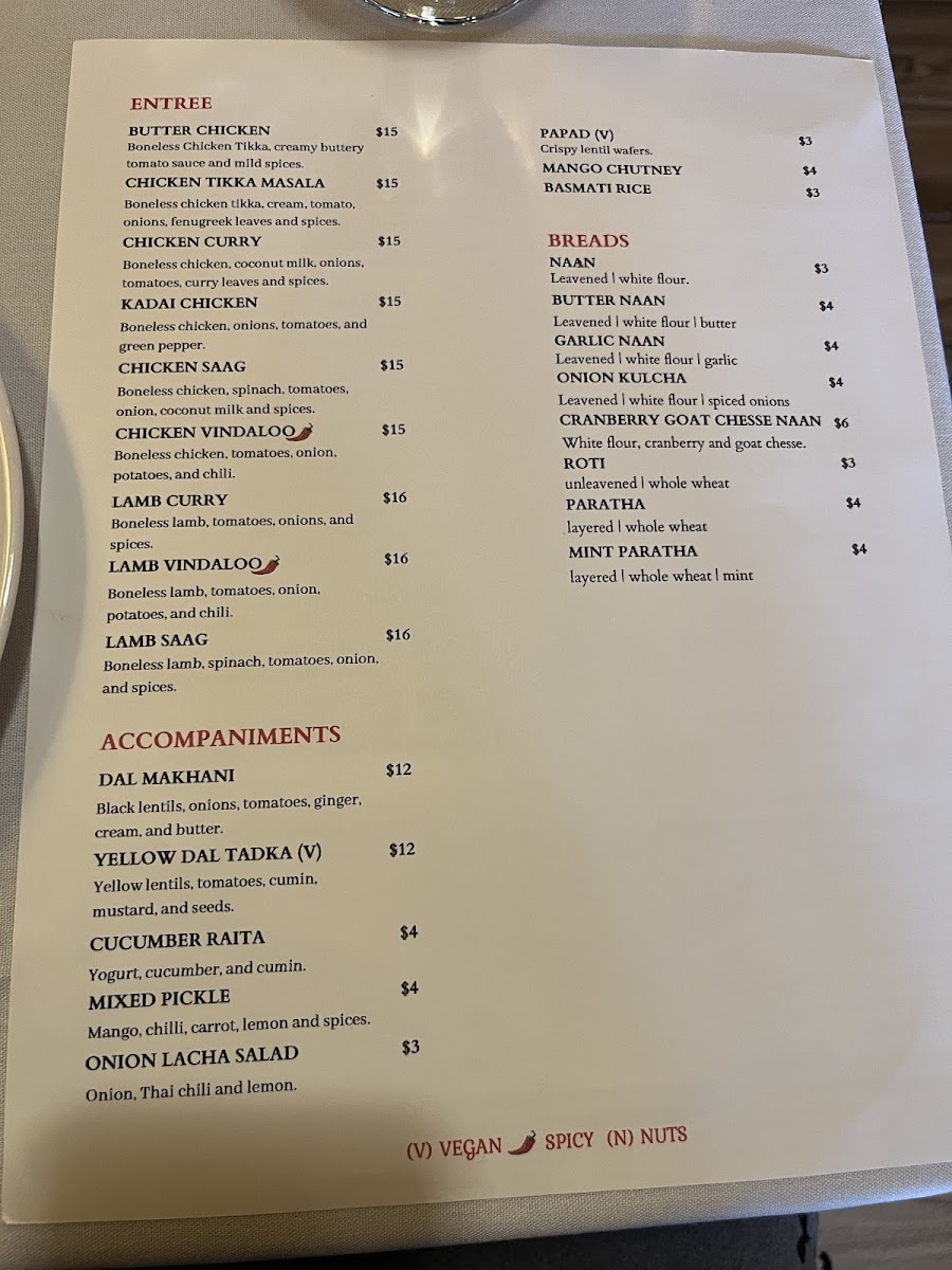 Start your journey with delightful Tandoori Breads, such as the buttery Butter Naan or the aromatic Garlic Naan—each priced between $3 to $6. For those seeking vegetarian entrees, options like Aloo Chole and Kadai Paneer beckon with vibrant spices and fresh ingredients, each lovingly crafted at $16 to $17.